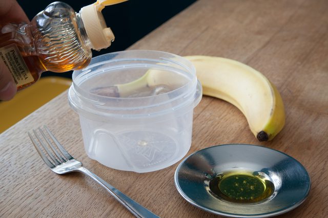 用叉子將一個香蕉放入碗中。加入1湯匙蜂蜜和3滴杏仁油。用手指將混合物按摩在頭皮上。用浴帽蓋住頭部,等待20分鐘。沖洗,洗髮和調理頭髮。