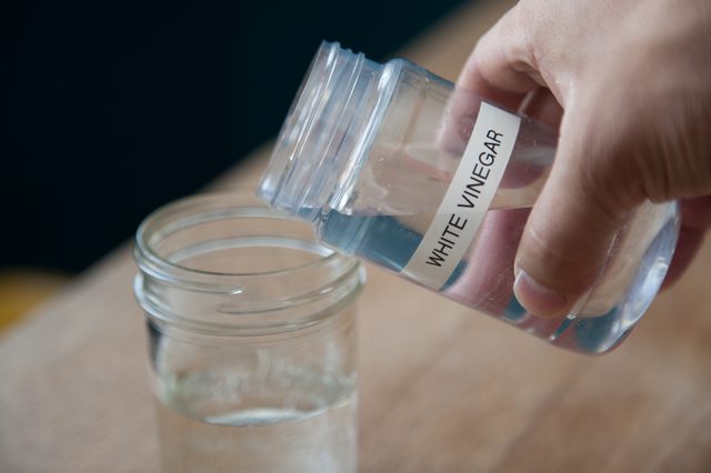 將1/2杯水和1/2杯白醋混合在一起。洗髮和調理後,將其倒在頭皮上。不要衝洗醋溶液,而是讓它乾燥到你的頭皮上。