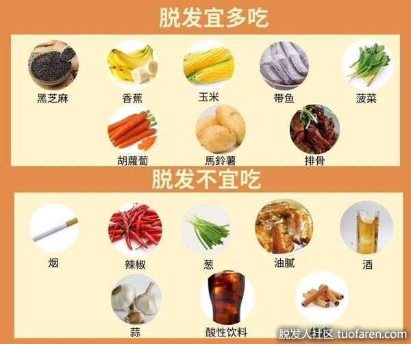 脱发者的脱发原因不同,但是需要忌口的东西是一样的!例如: ❌煙、酒及辛辣 ❌刺激食物 ❌蔥、蒜、韭菜、姜 ❌花椒、辣椒、桂皮等 ❌忌油膩、燥熱食物 ⛔️肥肉、油炸食品及忌過食糖和脂肪豐富的食物 如肝類、肉類、洋蔥等酸性食物。 ==================== ✅脱发患者通过以下饮食来治疗脱发: . 1️⃣植物蛋白,多食大豆、黑芝麻、玉米等食品。 2️⃣铁质,黃豆、黑豆、蛋类,禽类,带鱼,蝦,熟花生、菠菜、鯉魚、香蕉、 胡萝卜、马铃薯等。 3️⃣碘高的食物。 4️⃣碱性物质,如新鮮蔬菜、水果。 5️⃣維生素E丰富的食物,如芹菜、莧菜、菠菜、枸杞菜、芥菜、金針菜、黑芝麻等。 6️⃣吃含粘蛋白的骨胶质多的食物,如牛骨湯、排骨湯等。