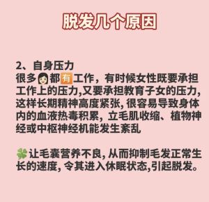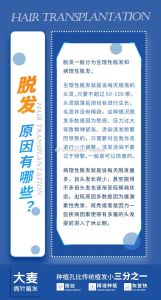 脱发的原因有哪些? 脱发一般分为生理性脱发和病理性脱发。 生理性脱发就是说每天脱落的头发,只要不超过50-100根,头发脱落后但也有进行生长,毛发并没有稀疏。这种情况脱发多数是因为熬夜、压力过大导致精神紧张、烫染洗发频繁而导致的,只需要对自我作息进行一个调整,洗发烫染不要过于频繁,一般是可以改善的。 病理性脱发就是说每天脱发量多,且头发长得少,甚至脱得不多但头发也逐渐呈现稀疏状态。出现原因多数是因为雄激素性秃发、斑秃或者是因为一些疾病因素使得有多量的头发提前进入了休止期。 如果感觉自身脱发异常,建议引起重视,及早治疗,效果才可控,否则后期只能通过植发来进行改善了!