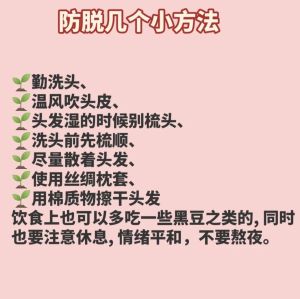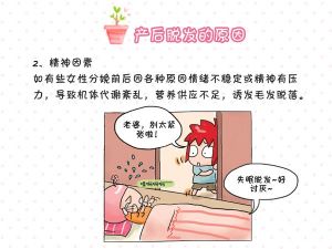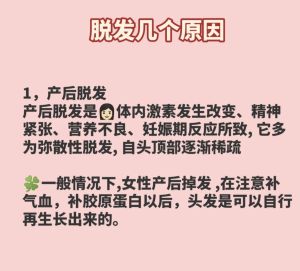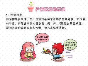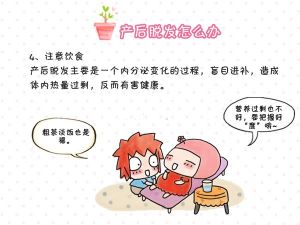 产后脱发是暂时性的,宝妈们可以通过四个方面进行调整。 1、保证睡眠,心情舒畅。减轻自己的精神负担,保持较为充足的睡眠。 2、科学洗发,日常护发。摒弃月子期不洗头的陈规陋习,注意洗头后及时吹干,避免着凉。 3、均衡膳食,营养健康。切记产后不宜过早节食减肥,容易导致营养不良,诱发脱发;也不能盲目进补,膳食热量超标也不利于头发的复生。产妇膳食要均衡,饮食上除了要适当多补充优质蛋白,还可以多补充一些果蔬、豆类、海藻类食物。 4、在医生的指导下服药。如果产后脱发很严重,必要时可以在医生的指导下,适量口服营养补充剂如谷维素、维生素B1、B6、A及铁剂、锌剂、钙剂。